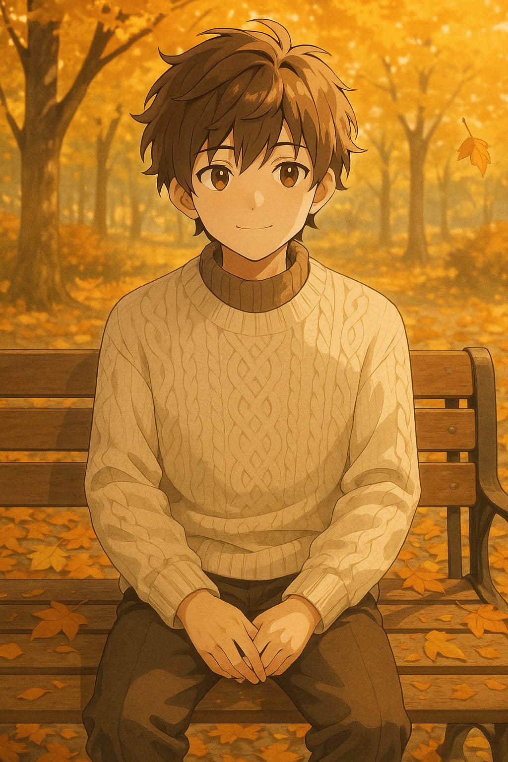 Anime boy in a cozy sweater sitting on a park bench surrounded by golden autumn leaves, warm aesthetic wallpaper.